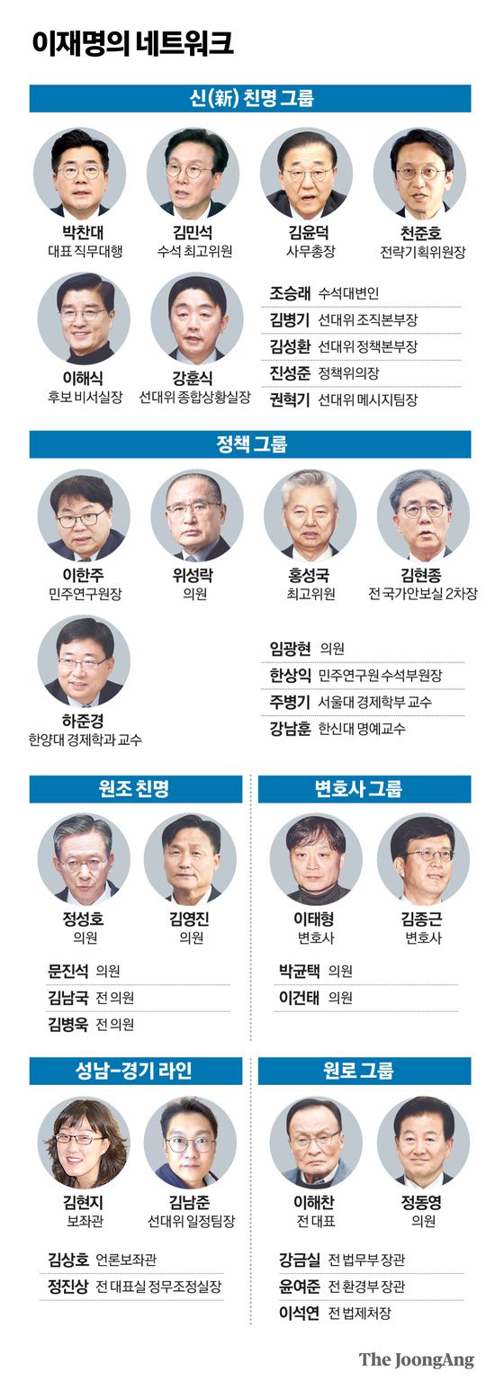 하지만 정작 이 당선인의 ‘킹메이커’는 따로 있다. 이 당선인의 측근 그룹은 ▶당 지도부 중심 신(新)친명 그룹 ▶성남·경기 라인 ▶원조 친명 그룹 ▶정책 그룹 ▶자신의 변호인단 등으로 세분화된다. 이들은 “친분보다 능력을 우선해 만인의 만인에 대한 투쟁 상태를 만든다”(친명계 인사)는 이 당선인 특유의 용인술에서 낙오되지 않은 생존자들이기도 하다.