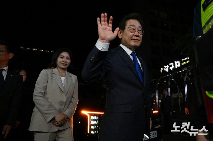 제21대 대통령 당선이 확실시되는 더불어민주당 이재명 대선 후보가 4일 선대위원장들에게 감사 인사를 하기 위해 서울 여의도 당사로 들어가고 있다.