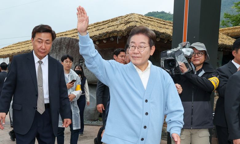 이재명 더불어민주당 대통령 후보가 지난 5월 15일 경남 하동군 화개장터 입구에서 광주 출신 30대 남성 문유성 씨, 대구 거주 20대 여성 김다니엘 씨와 유튜브 K-이니셔TV 케미폭발 '동서화합' 화개장터 라이브 오프닝을 마치고 이동하며 인사하고 있다. 뉴스1