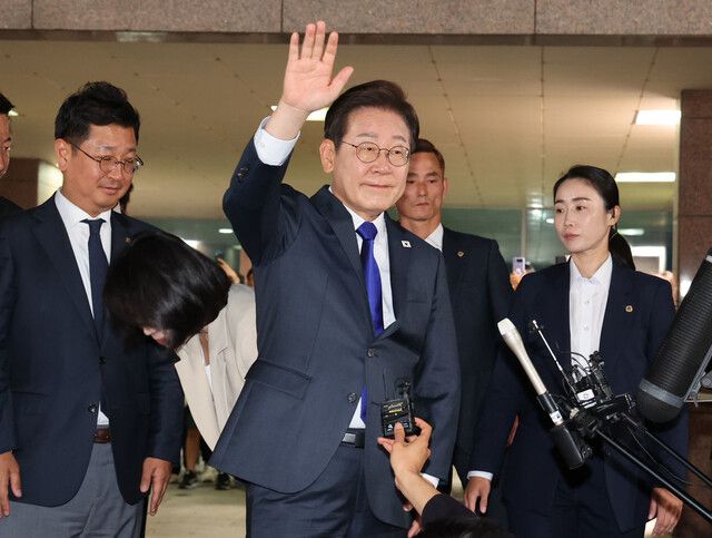 이재명 대통령 당선자가 3일 밤 인천 계양구 자택을 나와 손을 흔들고 있다. 김태형 기자 xogud555@hani.co.kr |