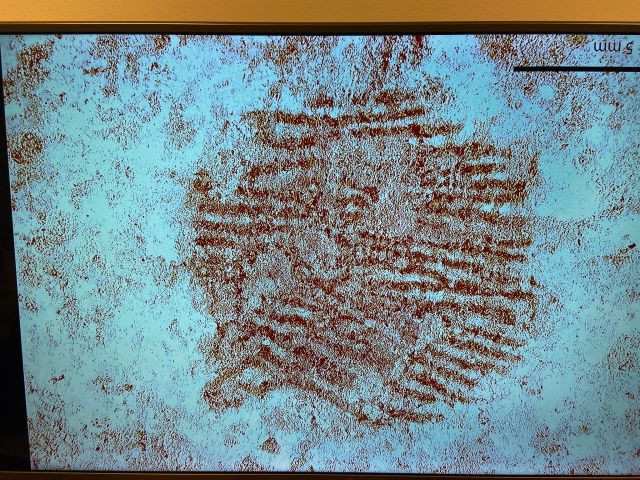 연구팀은 약 20cm 길이의 조약돌 중앙에 빨간 점 하나가 있는 것을 수상히 여겨 연구를 시작했다. 정밀조사 결과 천연 토양 색소인 황토색으로 나타났다. 해당 색소에는 철 산화물과 점토 광물이 포함돼 있었는데 이는 동굴 내부나 주변 다른 곳에서는 전혀 발견되지 않은 성분으로 나타났다.