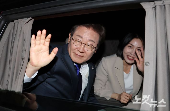 제21대 대통령 당선이 확실시되는 더불어민주당 이재명 대선 후보와 김혜경 여사가 4일 서울 여의도 국회 앞에 마련된 더불어민주당 국민 개표방송 행사를 마친 후 차량에 탑승해 인사하고 있다. 류영주 기자 |