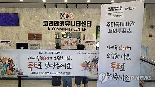 [연합뉴스 자료사진] 지난 20일(현지시간) 미국 버지니아주 코리안커뮤니티센터에 마련된 제21대 대통령선거 재외투표소. 2025.5.21 photo@yna.co.kr