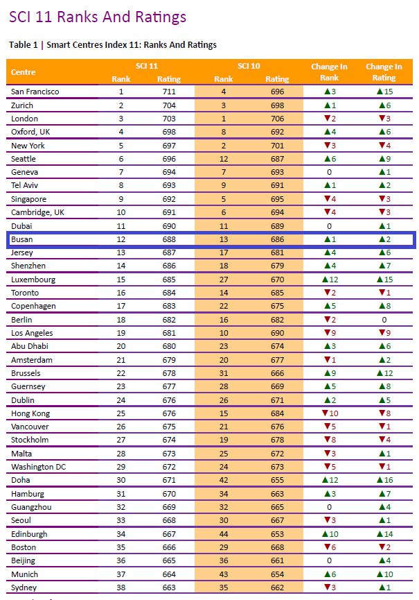 홍콩을 제치고 싱가포르에 이어 아시아 지역 두 번째로 높은 순위를 차지했으며, 국내에서는 서울(30위)을 앞서며 부동의 1위를 유지했다.