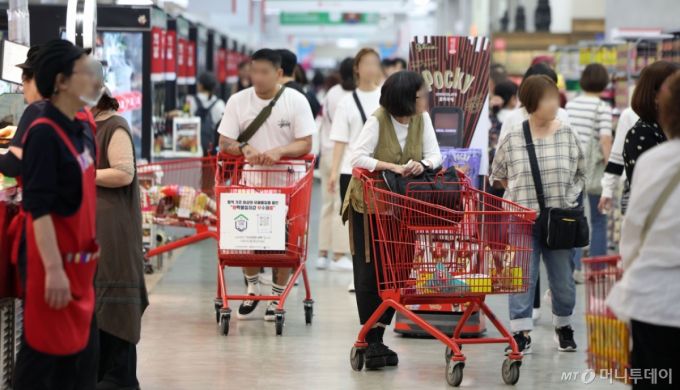 [서울=뉴시스] 김선웅 기자 = 올해 1분기 가구 실질소비지출이 코로나19 이후 가장 큰 폭으로 줄었다. 통계청이 발표한 2025년 1분기 가계동향에 따르면 올해 1분기 가구당 월평균 소비지출은 1년 전보다 1.4% 증가한 295만원으로 물가 수준을 고려한 실질소비지출은 0.7% 감소했다. 이는 2023년 2분기 이후 첫 감소 전환이며 코로나19 유행때인 2020년 4분기(-2.8%) 이후 가장 큰 폭으로 감소한 수치다. 29일 서울 소재 유통매장에서 시민들이 장을 보고 있다. 2025.05.29. |