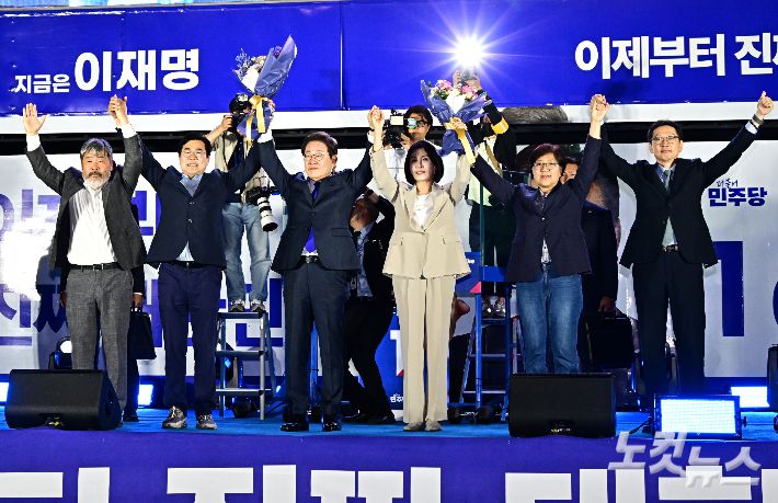이재명 대통령과 김혜경 여사를 비롯한 박찬대 상임총괄선대위원장, 정은경·김경수·김동명 상임선대위원장이 4일 서울 여의도 국회 앞에 마련된 더불어민주당 국민 개표방송 행사에서 손을 들어올리고 있다. 류영주 기자