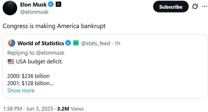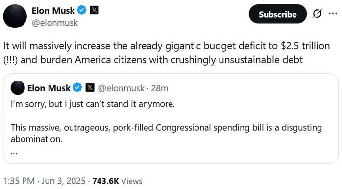 머스크는 이후 4분 만에 이 글에 덧붙여 "그것은 이미 거대한 규모인 예산 적자를 2조 5천억 달러로 급증시킬 것이며, 미국 시민들에게 감당할 수 없는 빚 부담을 지울 것"이라고 썼습니다.