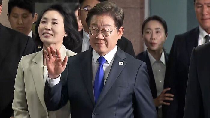밝은 미소와 함께 푸른색 넥타이를 매고 등장한 이 대통령은 김혜경 여사와 같이 자택 앞에 모인 지지자들과 인사를 나눴습니다.