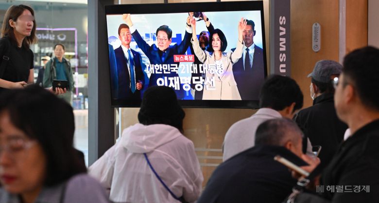 4일 오전 서울 용산구 서울역 대합실에서 시민들이 이재명 대통령 당선 관련 뉴스를 시청하고 있다. 임세준 기자