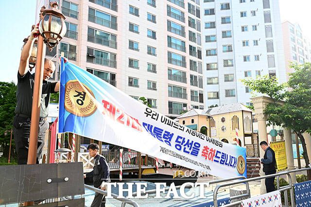 [더팩트ㅣ인천=남용희 기자] 4일 오전 인천 계양구 이재명 대통령 사저 아파트 단지에 대통령 당선 축하 현수막이 걸리고 있다.