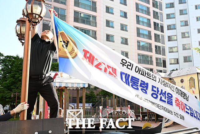 4일 오전 인천 계양구 이재명 대통령 사저 아파트 단지에 대통령 당선 축하 현수막이 걸리고 있다. /인천=남용희 기자 |