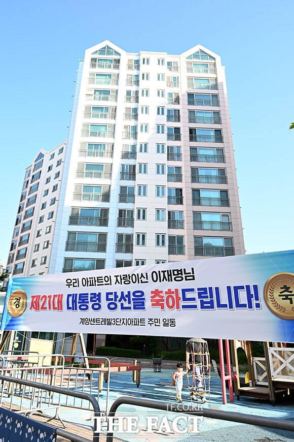 이재명 대통령 당선 축하 현수막 걸린 이 대통령 아파트 단지. |