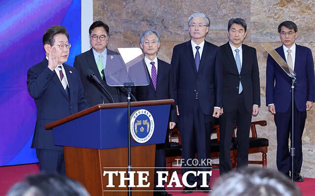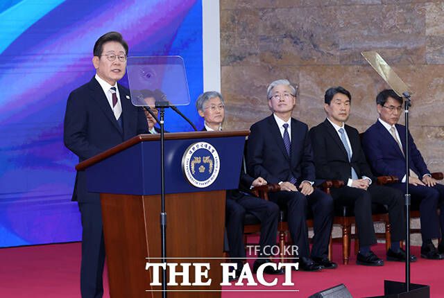 [더팩트ㅣ국회사진기자단] 이재명 대통령이 4일 오전 11시 서울 여의도 국회 로텐더홀에서 '취임선서'를 하고 있다.
