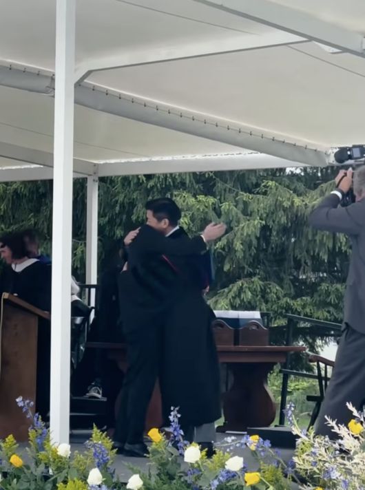 영상 속에는 막내 아들이 졸업장을 수여받고, 아버지 홍정욱과 뜨겁게 포옹하는 장면이 담겨 눈길을 끌었다.