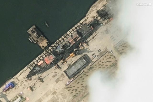 맥사 테크놀로지스가 제공한 지난달 18일 자 위성 사진에 북한 청진조선소에서 5000t 최현급 신형 구축함이 건조되고 있다. 이 구축함은 21일 진수에 실패해 파손됐다. AP 뉴시스 |
