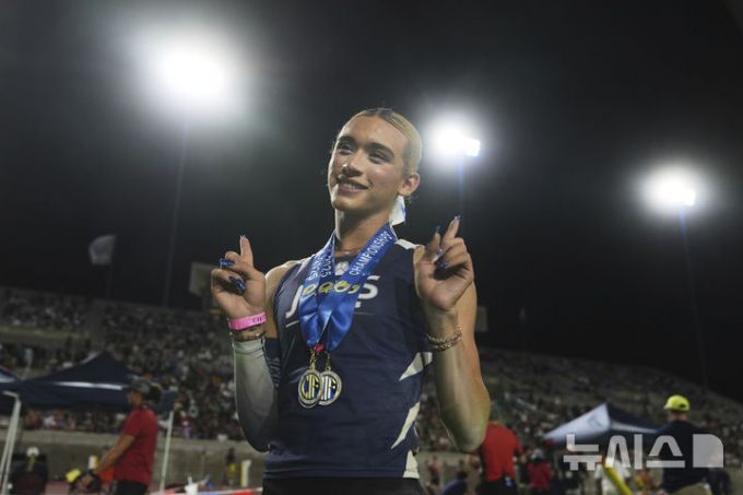 지난달 31일 캘리포니아주 클로비스에서 열린 캘리포니아 고등학교 여성 육상 선수권 대회에서 성전환 선수 AB 에르난데스가 메달과 함께 사진을 찍기 위해 포즈를 취하고 있다. /AP=뉴시스