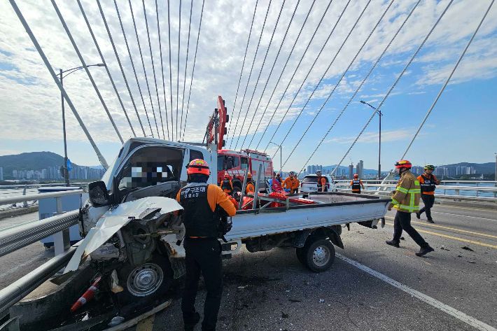 4일 오전 9시 20분쯤 강원 춘천시 근화동 춘천대교에서 카니발 승합차가 1차로에서 공사 작업 중이던 1t 트럭을 들이받았다. 강원소방본부 제공. |