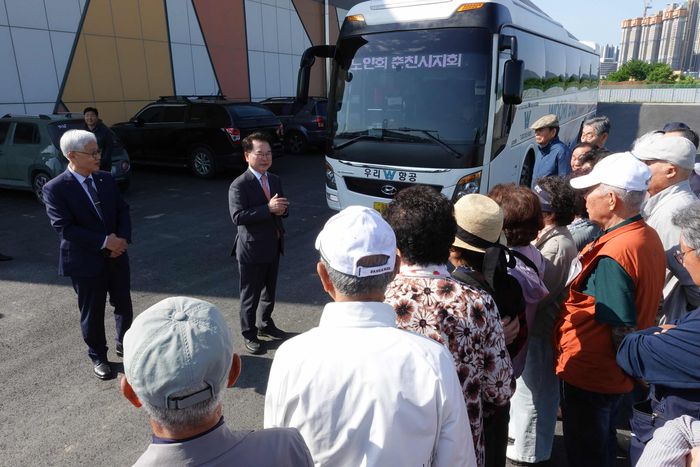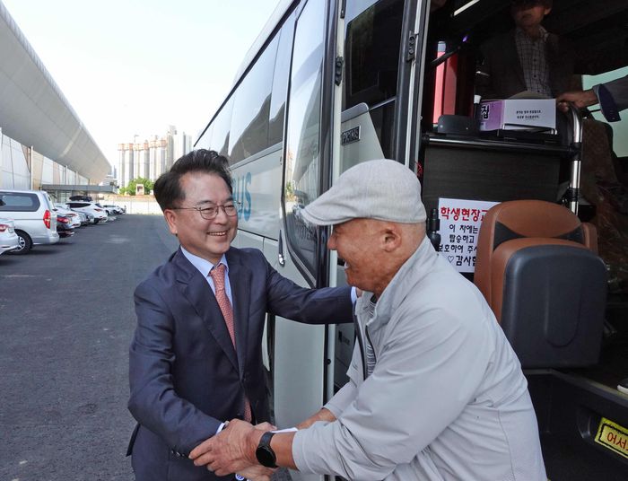 [스포츠서울ㅣ춘천=김기원기자]육동한 춘천시장이 4일 봄내체육관 앞에서 2025년 경로당 임원 위탁교육을 가는 경로당 임원들을 격려했다.