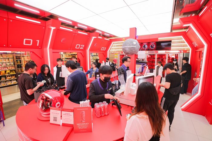 CU 올림픽광장점은 상품의 세계관을 반영해 점포 전체를 우주 정거장 콘셉트로 꾸몄다. 내·외부는 레드 하이볼과 동일한 붉은 색상으로 조성했다. 피스마이너스원 행성 조형물과 디지털 사이니지, 우주복 증강현실(AR) 셀카존 등 체험 요소를 곳곳에 설치했다.