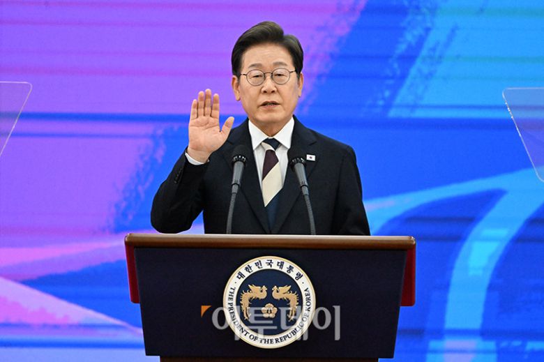 이재명 대통령이 4일 서울 여의도 국회 의사당 로텐더홀)에서 제21대 대통령 취임선서를 하고 있다. 국회사진기자단 |