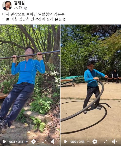 제 21대 대통령선거에서 김문수 캠프 비서실장을 맡았던 김재원 전 국민의힘 최고위원은 오늘 오후 자신의 SNS에 "다시 일상으로 돌아간 열혈 청년 김문수. 오늘 아침 집 근처 관악산에 올라 운동 중"이라는 내용의 글을 올렸습니다.