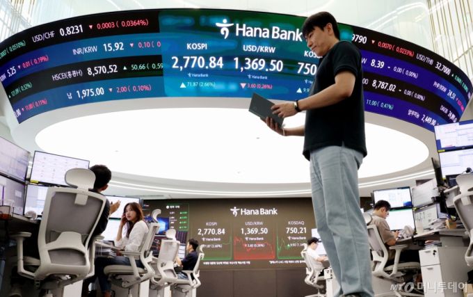 [서울=뉴시스] 김진아 기자 = 이재명 대통령의 증시 부양 기대감에 증권주가 일제히 강세를 보이고 있는  4일 서울 중구 하나은행 딜링룸에서 딜러들이 업무를 보고 있다.   코스피는 전 거래일(2698.97)보다 71.87포인트(2.66%) 급등한 2770.84에, 코스닥 지수는 전 거래일(740.29)보다 9.92포인트(1.34%) 오른 750.21에 거래를 종료했다. 서울 외환시장에서 원·달러 환율은 전 거래일(1373.1원)보다 3.6원 내린 1369.5원에 주간 거래를 마감했다. 2025.06.04. bluesoda@newsis.com /사진=김진아