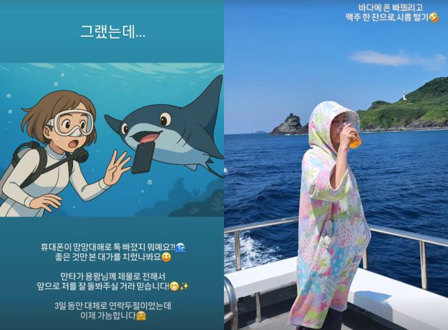 하지만 그는 "그랬는데... 휴대폰이 망망대해로 톡 빠졌지 뭐예요? 좋은 것만 본 대가를 치렀나봐요"라고 돌발 사태를 전했다.