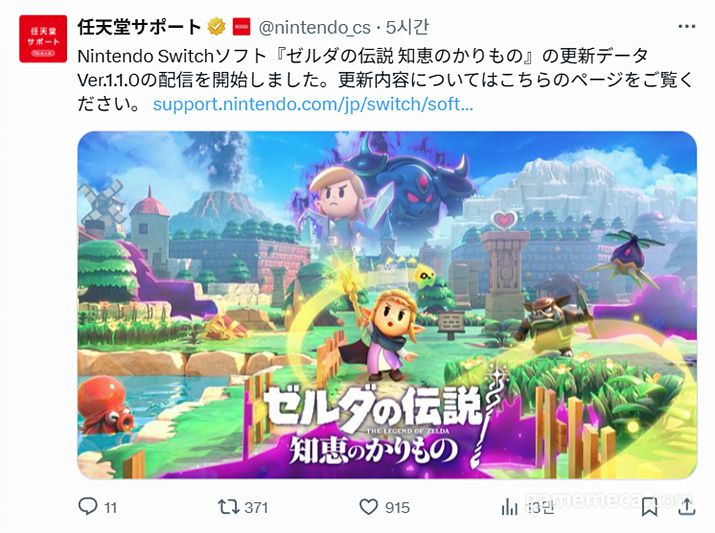 ▲ 젤다의 전설 지혜의 투영 업데이트 안내 (사진출처: 닌텐도 공식 X) |