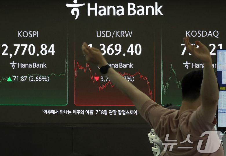 강력한 자본시장 선진화 의지를 보여온 이재명 대통령 취임 첫날인 4일 오후 서울 중구 하나은행 본점 딜링룸 전광판에 증시가 표시되고 있다. 이날 코스피 지수는 전 거래일 대비 71.87p(2.66%) 오른 2,770.84, 코스닥 지수는 9.92p(1.34%) 오른 750.21으로 마감했으며, 달러·원 환율은 3.57원 내려 1,369.40원을 보이고 있다. 2025.6.4/뉴스1 ⓒ News1 박정호 기자
