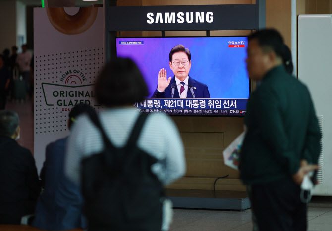 4일 서울역에서 시민들이 TV를 통해 이재명 대통령의 취임 선서식을 보고 있다. (사진=연합뉴스) |