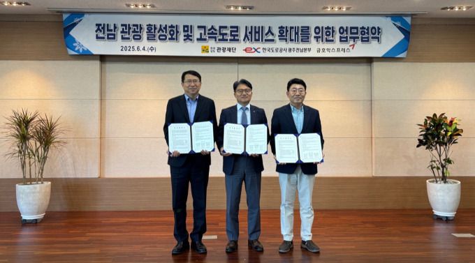 [무안·광주=뉴스핌] 조은정 기자 = 한국도로공사 광주전남본부가 전남관광재단, 금호익스프레스와 함께 지역 관광 활성화와 고속도로 이용편의 증진을 위한 업무협약을 4일 체결했다고 밝혔다.