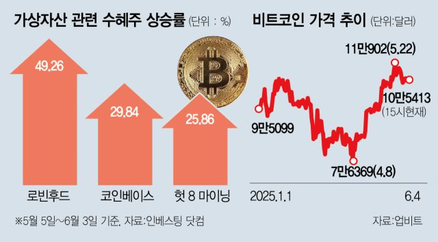 가상자산 선물 거래 서비스를 제공 중인 미국 온라인 증권사 로빈후드는 대표적인 가상자산 수혜주다. 지난해 도널드 트럼프 미국 대통령 당선 확정 이후에는 비트코인 가격이 폭등하며 거래량이 급증한 덕에 호실적을 거뒀다. 지난해 4분기 로빈후드의 가상자산 거래량은 전년 동기 대비 455% 증가한 710억 달러(약 98조 원)를 기록했다. 안영준 키움증권 연구원은 “법인세 환입과 규제 변경 효과 등 일회성 요인을 제외한 로빈후드의 지난해 4분기 순이익은 전년 동기 대비 154% 증가한 4억 9200달러(약 6758억 원)에 달한다”고 설명했다.