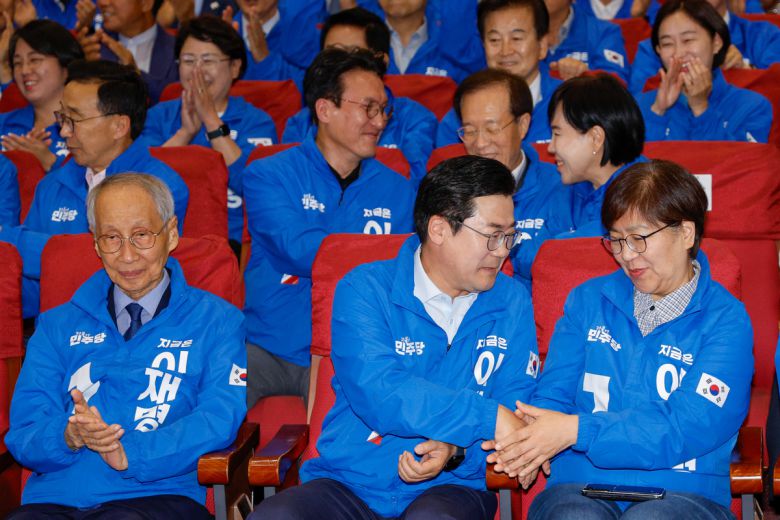 박찬대 진짜 대한민국 선거대책위원회 상임총괄선대위원장과 정은경 총괄선대위원장이 3일 오후 서울 여의도 국회 의원회관에 마련된 제21대 대통령선거 개표상황실에서 방송사 출구조사 결과를 확인후 악수하고 있다. 공동취재 |