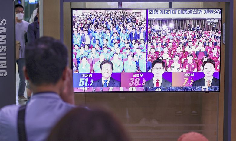 제21대 대통령 선거날인 지난 3일 서울 중구 서울역 대합실에서 시민들이 방송3사(KBS,MBC,SBS) 출구조사 결과를 시청하고 있다. 뉴시스 |