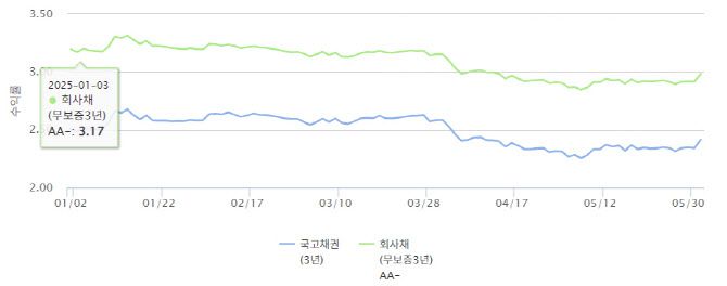 국채 3년물과 회사채(무보증 3년) AA- 등급 금리 추이(자료: 금융투자협회 채권정보센터) |