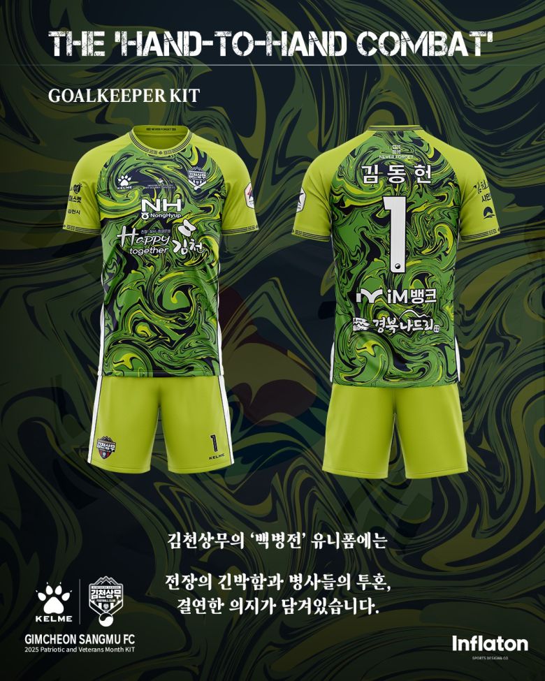 프로축구 K리그1 김천상무프로축구단이 6월 호국보훈의 달을 기념하는 호국보훈 유니폼을 공개했다. 이번 호국보훈 유니폼은 ‘백병전(HAND TO HAND COMBAT)’에서 영감을 받아 전장의 긴박함과 병사들의 투혼과 결연한 의지를 나타내었다.