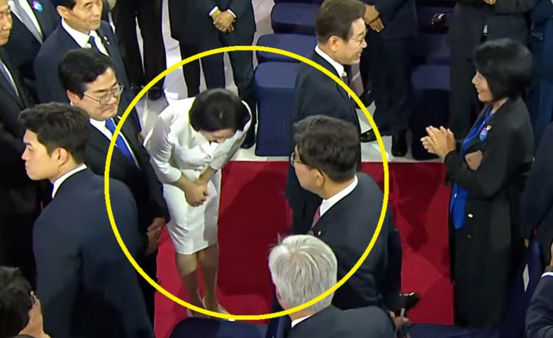 이재명 대통령의 배우자 김혜경 여사가 4일 서울 여의도 국회 본청 로텐더홀에서 열린 제21대 대통령 취임 선서에서 국민의힘 권성동 원내대표에게 인사하고 있다. JTBC 보도화면 캡처