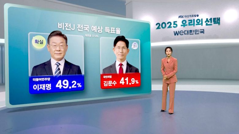 [JTBC 예측조사 결과 민주당 이재명 후보 50.6%로 예측 1위, 국민의힘 김문수 후보 39.4%로 예측 2위입니다.]