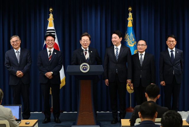 이재명 대통령이 4일 서울 용산 대통령실 청사에서 국무총리 후보자 등 새 정부 첫 인사 발표를 하고 있다. 왼쪽부터 이종석 국가정보원장 후보자, 김민석 국무총리 후보자, 이 대통령, 강훈식 비서실장, 위성락 국가안보실장, 황인권 경호처장. 대통령실사진기자단 |