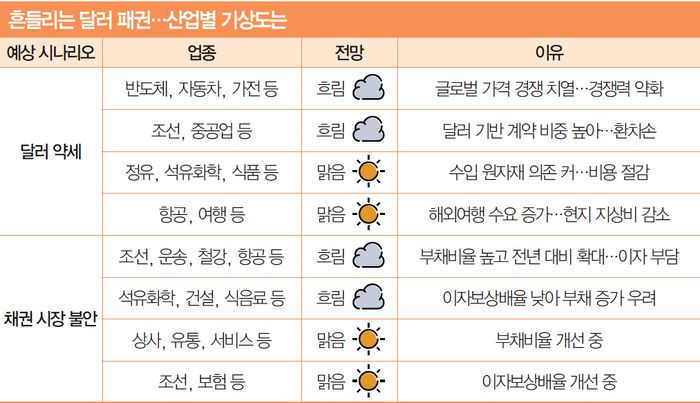 해외 수주 잔고가 많은 조선·중공업 기업도 불리하다. 달러 기반 계약 비중이 높아 실제 환산 수익 감소 가능성이 커진다. 해외 서비스 매출을 달러로 받는 주요 IT·소프트웨어 기업도 실질적인 매출 감소 현상이 발생한다.