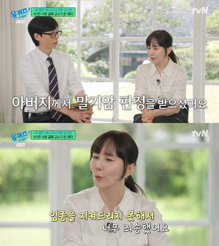 이 가운데 아버지가 말기암 판정을 받았다고. 해이는 “아빠 곁에 있어야겠다는 마음이 커서 교수를 포기하고 한국으로 돌아와야겠다고 생각했는데 아빠가 ‘아빠 때문에 포기하지 마라. 그건 아빠를 위한 게 아니니 끝까지 네 꿈을 위해서 나아가라’라고 했다”고 말했다.