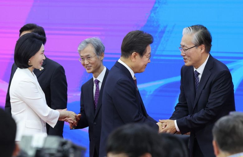 조희대 대법원장과 ‘어색한 만남’ 이재명 대통령이 4일 국회 로텐더홀에서 취임선서 행사를 마친 뒤 조희대 대법원장·김형두 헌법재판소장 권한대행 등과 인사를 나누고 있다. 왼쪽부터 김혜경 여사, 조 대법원장, 이 대통령, 김 권한대행. 박민규 선임기자 parkyu@kyunghyang.com |