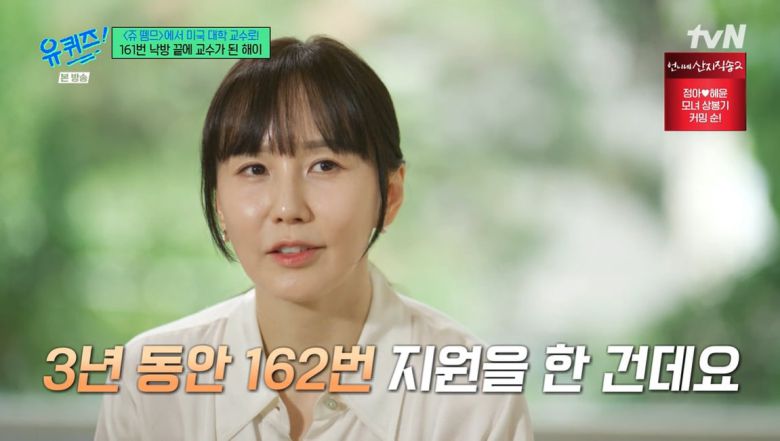 해이는 육아와 공부를 병행하기가 힘들었다고. 3년간 교수라는 목표를 세우고 162번 도전을 했다는 해이는 "최종 단계까지 떨어진 적이 많았다. 내 그릇이 아닌데 욕심을 내는 건가? 버텨야 하는 과정이 너무 힘들었다"고 고백했다.