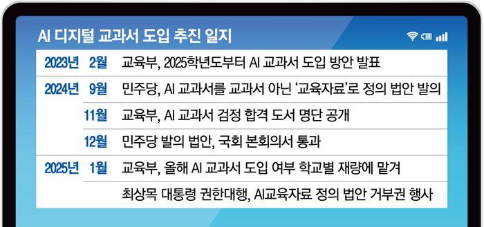 4일 교육계에 따르면 윤석열 정부는 올해 3월부터 전국 초등학교 3·4학년과 중학교 1학년, 고등학교 1학년 영어·수학·정보 과목에 AI 교과서를 도입했다. 당초 윤석열 정부는 AI 교과서를 전국 모든 학교의 해당 학년에 ‘전면 도입’한다는 계획이었지만, 교원·학부모들의 우려와 더불어민주당의 강한 반발에 올해는 ‘학교 자율’에 따라 시범 도입하고 차차 도입 범위를 확대한다는 계획이었다.