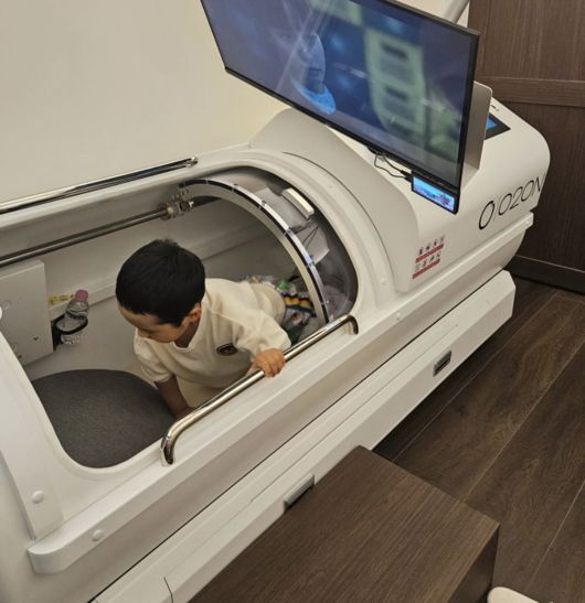 이어진 사진에는 작은 캡슐 안에서 놀고 있는 아들의 모습이 담겼다. 산소 캡슐처럼 보이는 장비 안에 몸을 반쯤 누인 채 장난을 치는 아들, 그리고 그런 아들을 묵묵히 지켜보는 엄마 한가인의 분위기가 오롯이 전해진다.