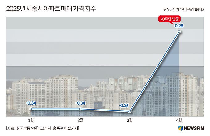 부동산 플랫폼 직방에 따르면 지난 4월 세종시 아파트 매매 중 이전 거래가보다 상승한 거래 비중이 52.7%로 22개월 만에 최고치를 기록했으며 전월(45.3%) 대비 7.4p(포인트) 올랐다. 아파트 거래량은 1290건으로, 같은 해 1월(305건) 대비 4배 이상 증가했다. 주택 매수 심리도 증가했다. 지난 4월 세종시 주택매매 소비심리지수는 전월 대비 35.9p 급등한 157.6p을 기록하며 전국 최고치를 나타냈다. 이는 서울(120.5p)보다도 훨씬 높은 수치다.