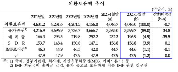[서울=뉴스핌] 온종훈 선임기자 =5월말 기준 우리나라의 외환보유액은 4046억 달러로 전월말 대비 0.7억 달러 감소했다.