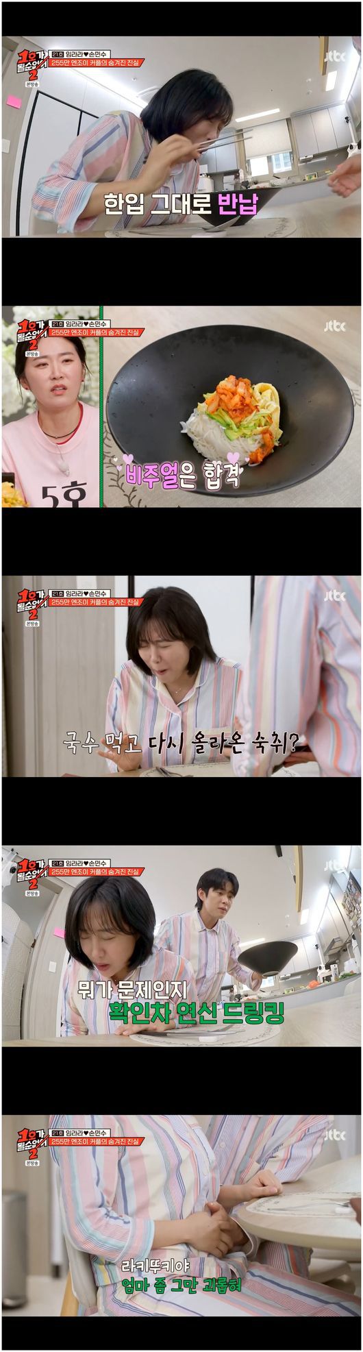 손민수는 임라라를 위해 김치전과 숭늉을 준비했다. 김치전까지 태워먹자 임라라는 화를 꾹꾹 참았다. 임라라는 “그냥 숭늉 국물이라도 끓여줘. 이번에 실패하면 나 진짜 못 참는다”라며 부탁했다.
