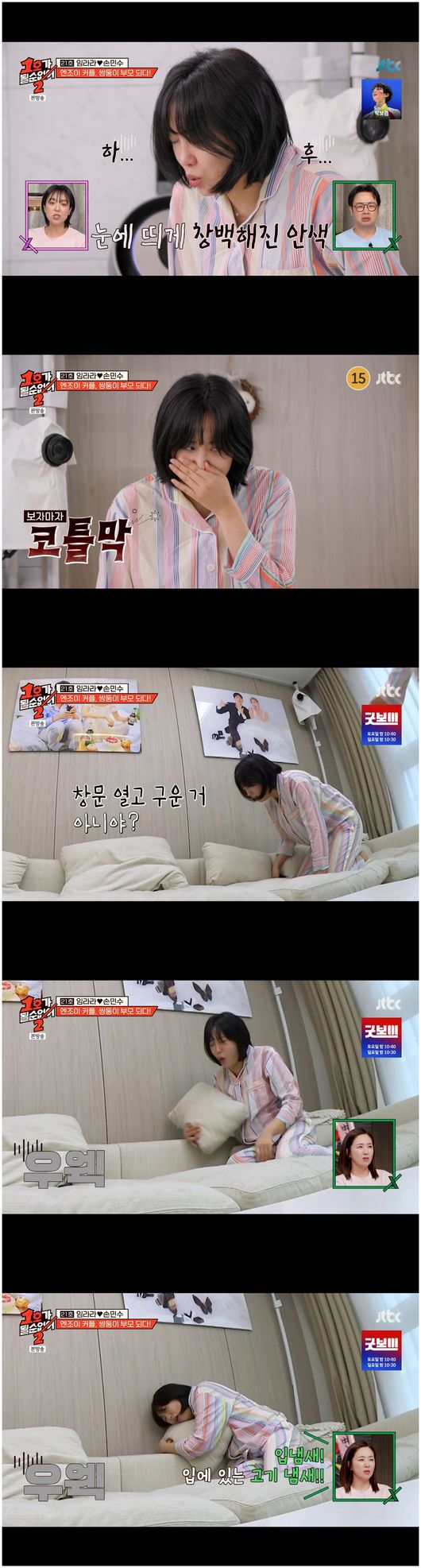 임라라는 녹화일 기준 임신 14주 차, 그것도 쌍둥이었다. 임라라는 “임신 사실 알자마자 입덧이 시작됐는데, 아예 일상이 안 된다. 입덧약을 풀로 먹어도 입덧이 너무 심하다”라면서 “하루는 토하다가 기절하면서, 문을 열면서 기절했다. 아이가 잘못될까 봐”라고 말했다.