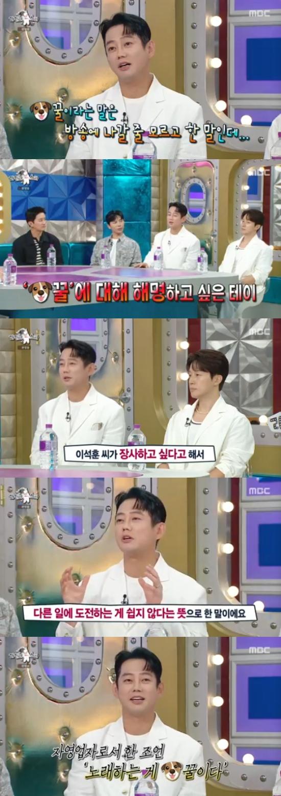 이날 방송에서 테이는 한 예능 프로그램에 출연해 "연예인이 개꿀"이라고 말해 화제가 된 것을 언급하며 "그 말이 방송에 나갈 줄은 몰랐다. 이석훈 씨가 장사를 한다고 했을 때 '연예인이 개꿀'이라는 말을 했었다"고 말했다.